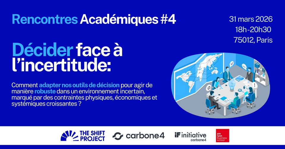 🎯Cette soirée restitue les principaux enseignements d’un séminaire scientifique transdisciplinaire From Modeling to Strategic Decision Making tenu en juin 2024 à l’École de Physique des Houches et co-organisé par Carbone 4, The Shift Project, emlyon business school, le CEA et le CEA-i-Tésé. Ce séminaire a réuni près de 70 chercheur.es et acteurs de la transition issus de disciplines variées (modélisation, économie, design, sociologie, sciences de la terre et du Vivant, stratégie, prospective…). A l’occasion de la publication de la synthèse de ce séminaire, cette soirée d’échange propose de mettre quatre grands enjeux qui ont animé ce séminaire en discussion avec celles et ceux qui, au quotidien, doivent décider dans l’incertitude :