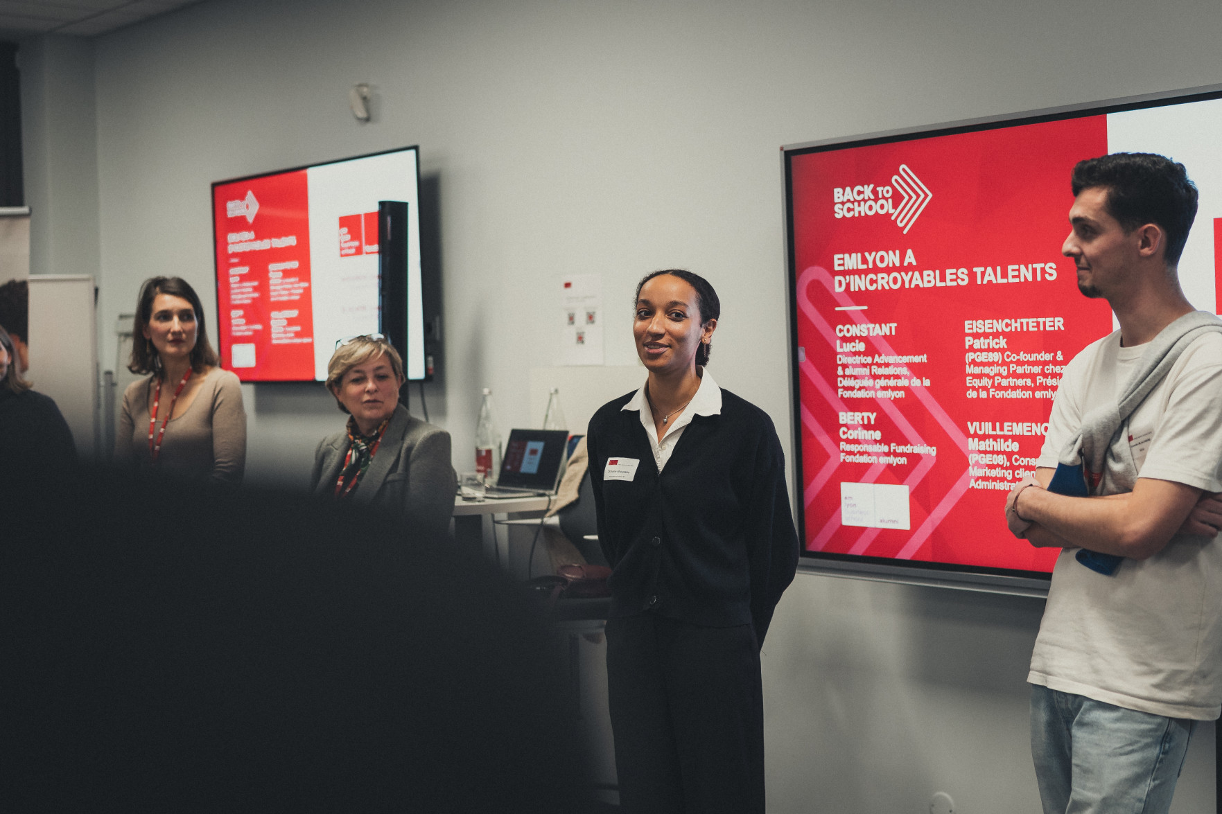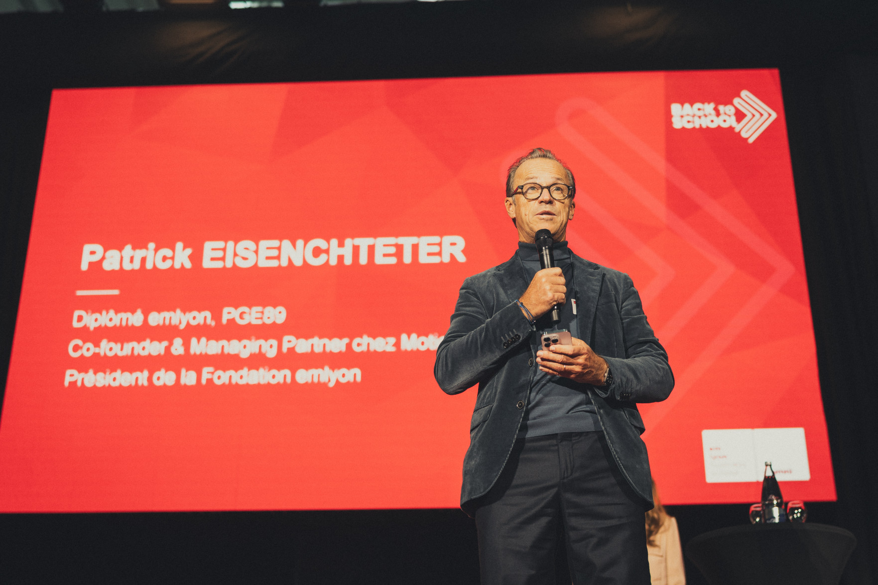 - Patrick Eisenchteter (PGE89), Co-founder & Managing Partner chez Motion Equity Partners et Président de la Fondation emlyon, a rappelé la mission essentielle de la fondation : soutenir les étudiants les plus défavorisés afin qu’ils puissent profiter pleinement de leur scolarité. Il a présenté les principaux dispositifs — bourses de vie, fonds d’urgence, bourses handicap et Tour de France des oraux. Il a appelé les alumni à se mobiliser davantage, rappelant que chaque don, largement déductible fiscalement, a un impact direct et déterminant pour ces étudiants méritants.